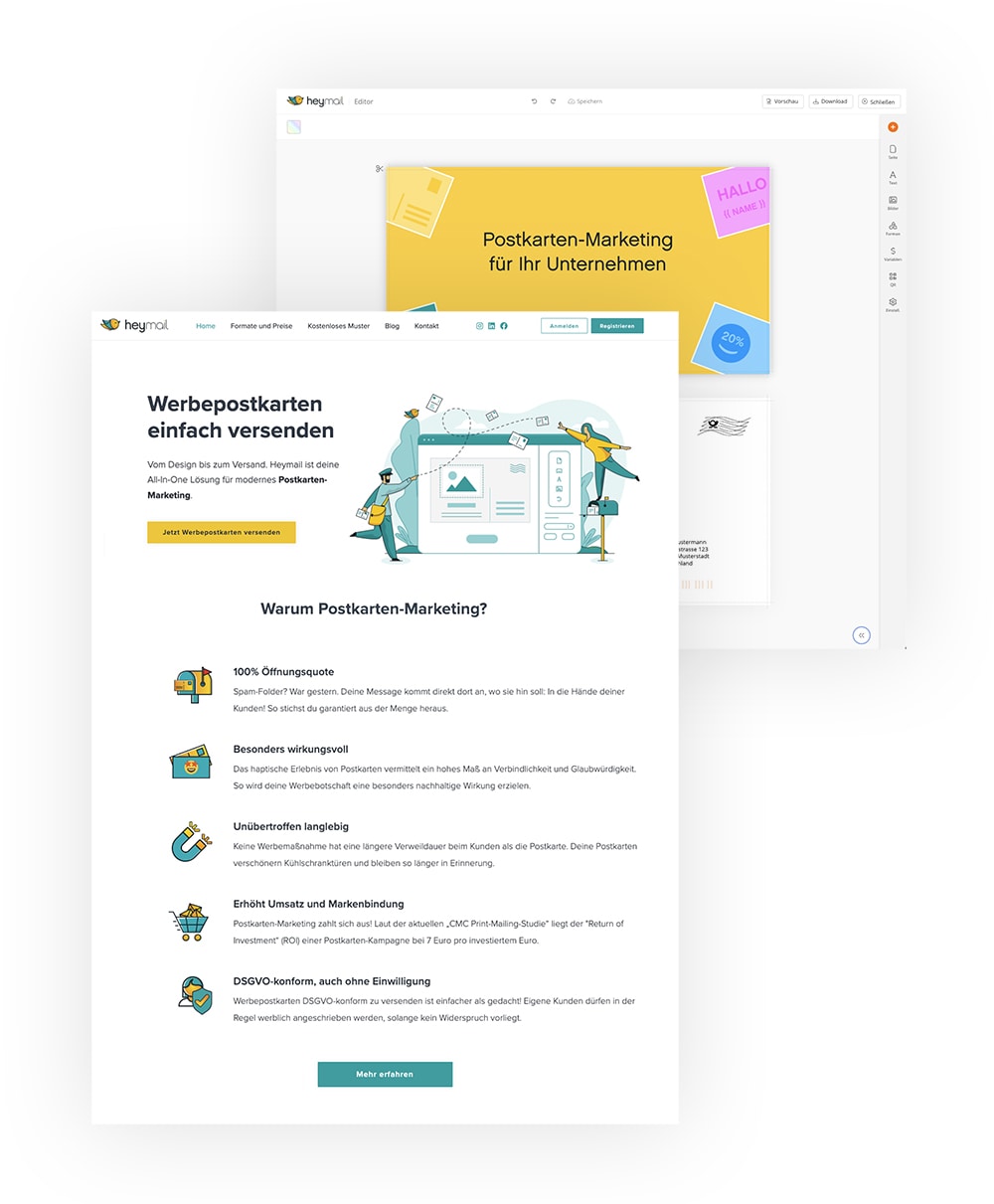 Heymail.com ist eine intuitive SaaS-Webanwendung, die es Unternehmen ermöglicht, Postkarten-Marketingkampagnen einfach zu erstellen und zu verwalten. Unsere Plattform bietet personalisierte Gestaltungsoptionen, zielgerichtete Segmentierung und Echtzeit-Analysen zur Performance-Messung. Mit Heymail kombinieren wir die Wirksamkeit traditioneller Postkarten mit modernen, digitalen Marketingstrategien. Unser Ziel ist es, Postkartenmarketing zugänglicher und wirkungsvoller für Unternehmen jeder Größe zu machen.